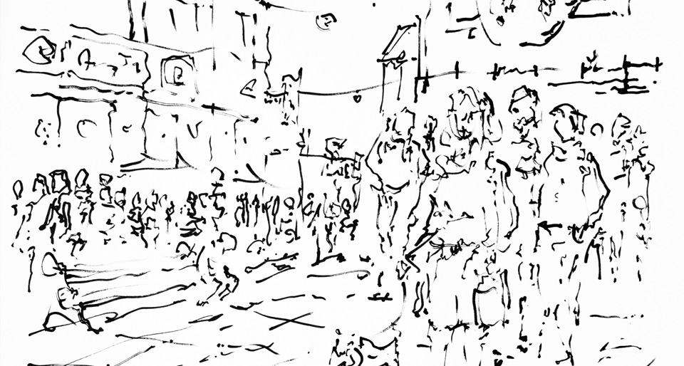 Barbara Vermeiren transposes the landscapes of contemporary metropolis filled with buildings, shop windows, advertisements and vehicles into synthetic, black and white compositions made of sophisticated lines...